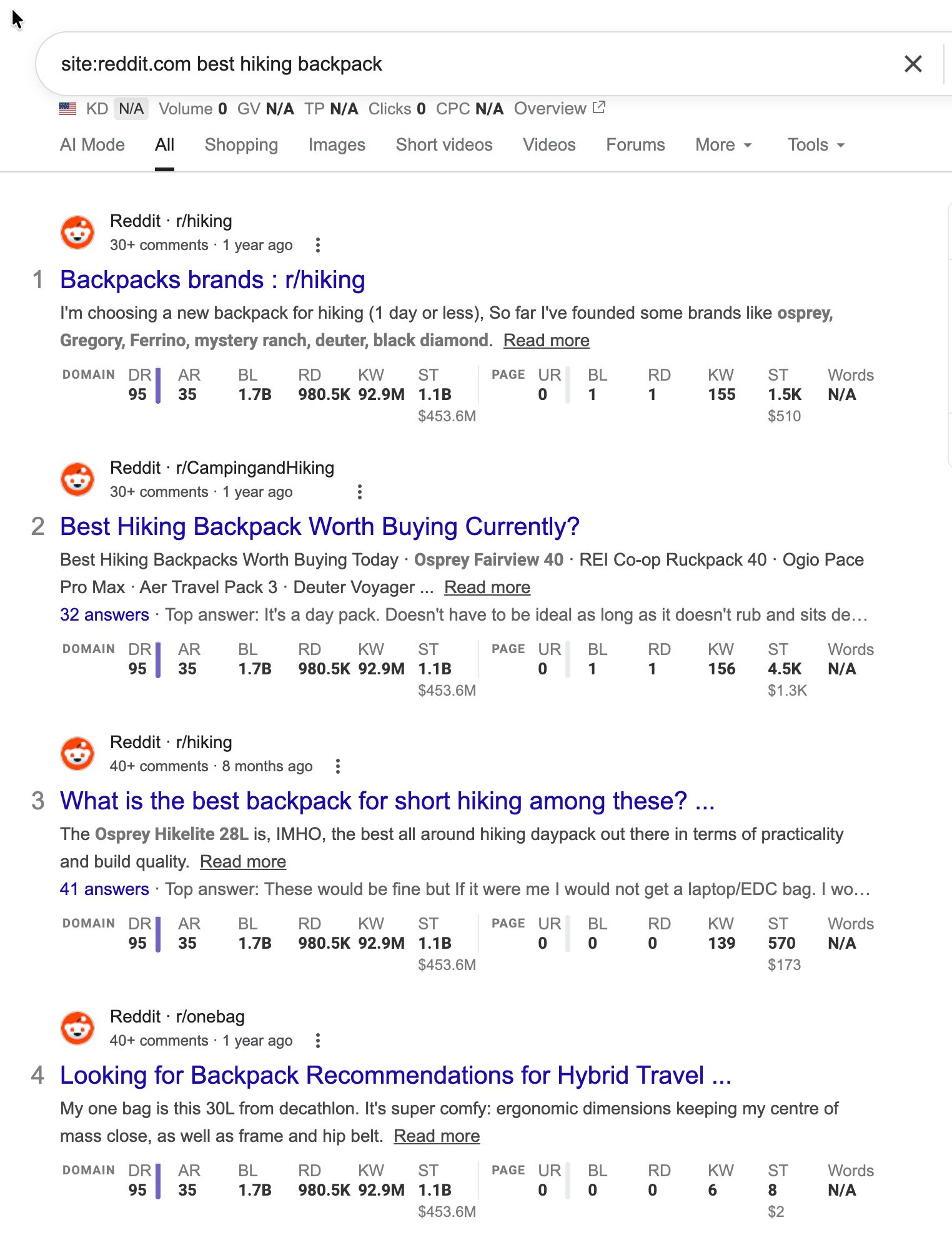 For example, searching site:reddit.com "best hiking backpack" shows dozens of discussion threads ranking. Each one is packed full of keyword ideas that you could use to shape your next content idea: