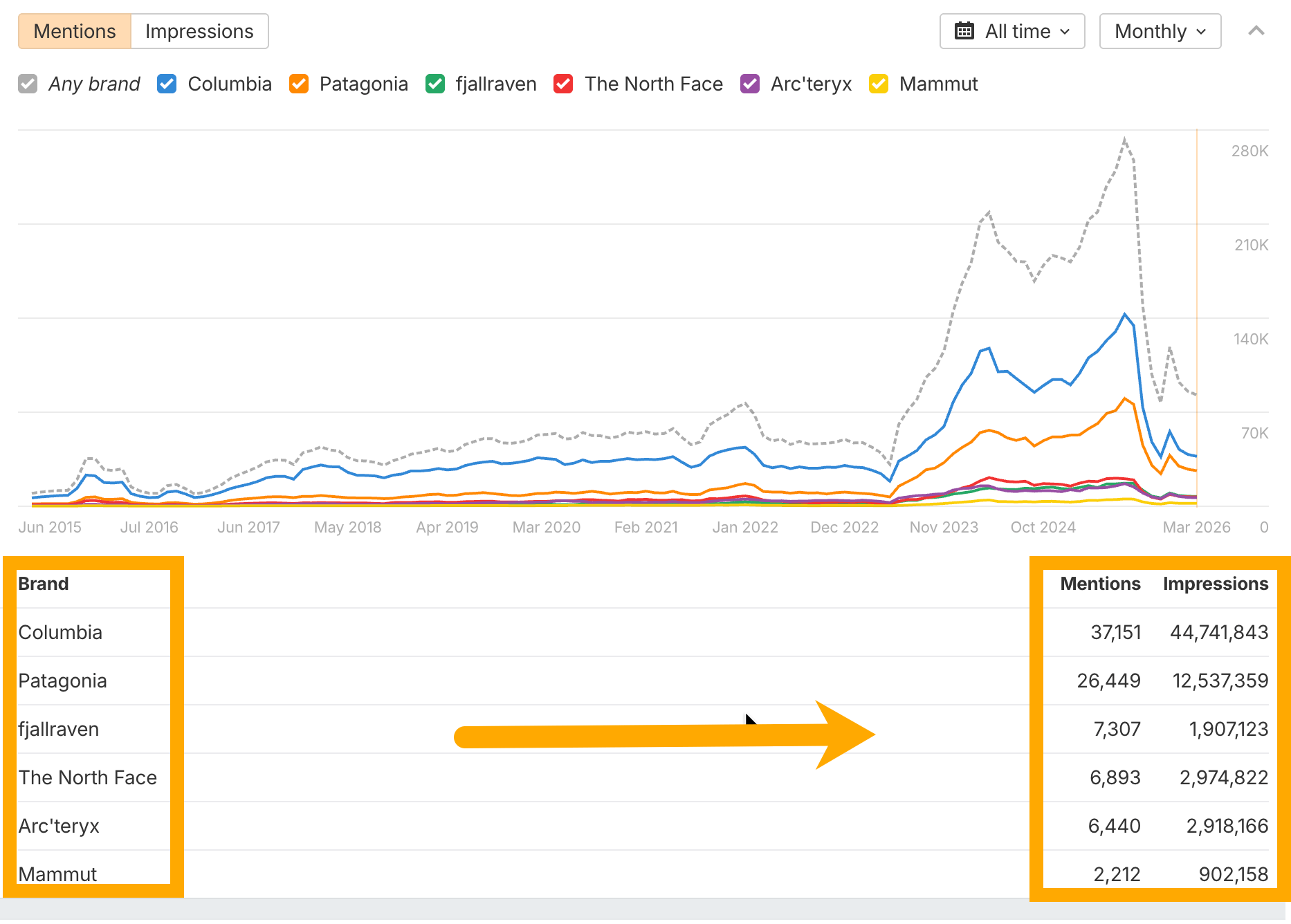 - Find gaps where competitors get mentioned but you don’t. If someone asks “what’s the best hiking backpack?” and every reply mentions Osprey, Gregory, and Deuter but not Fjällräven — that’s a visibility gap. And if that thread ranks in Google, it’s also a keyword gap