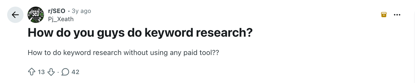 Take this example: a post in /r/SEO titled “How do you guys do keyword research?” has 42 upvotes and ranks #1 for our target keyword. The thread is full of practitioners sharing their actual workflows, favorite tools, and frustrations with existing options.