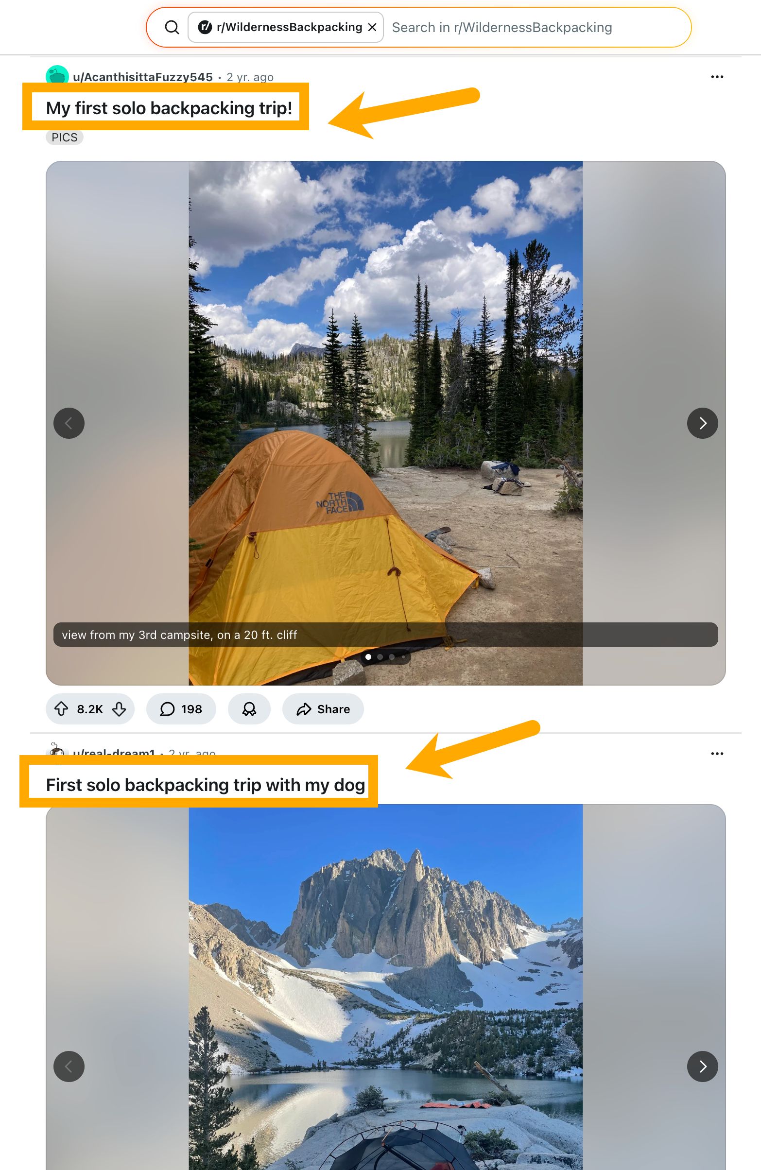 Here’s an example. If I search for “hiking”, r/WildernessBackpacking is one of the most popular subreddits. Searching the subreddit’s top posts, two of the most popular posts cover the same topic: solo backpacking trips.