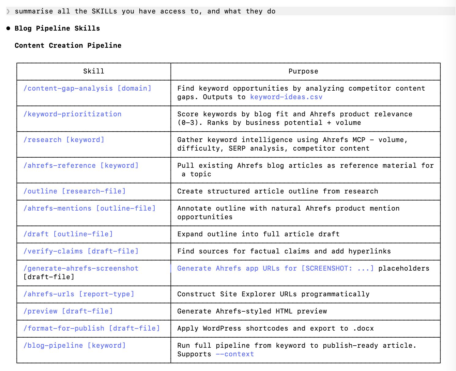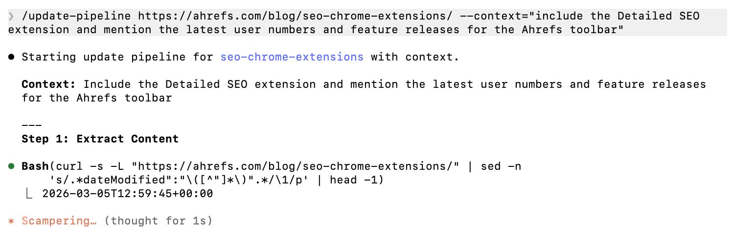 Whether I have persuaded you or not, at the time of writing, there are significant parts of my role I have already outsourced to generative AI. I use Claude Code, the Ahrefs MCP, and a series of ~15 custom SKILLs, chained together in sequence, to update old articles and create helpful, high-quality content.