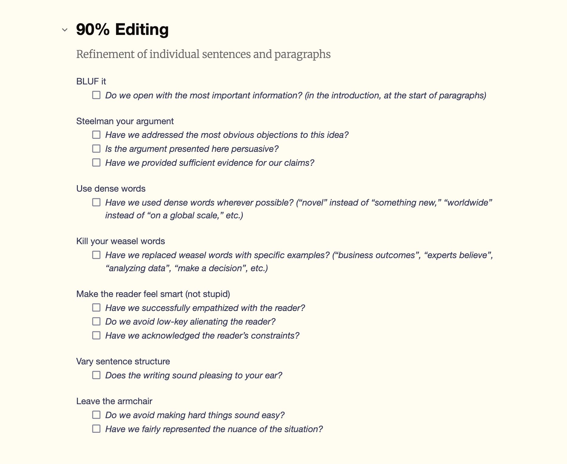 - Have we replaced weasel words with specific examples? (“business outcomes”, “experts believe”, “analyzing data”, “make a decision”, etc.)