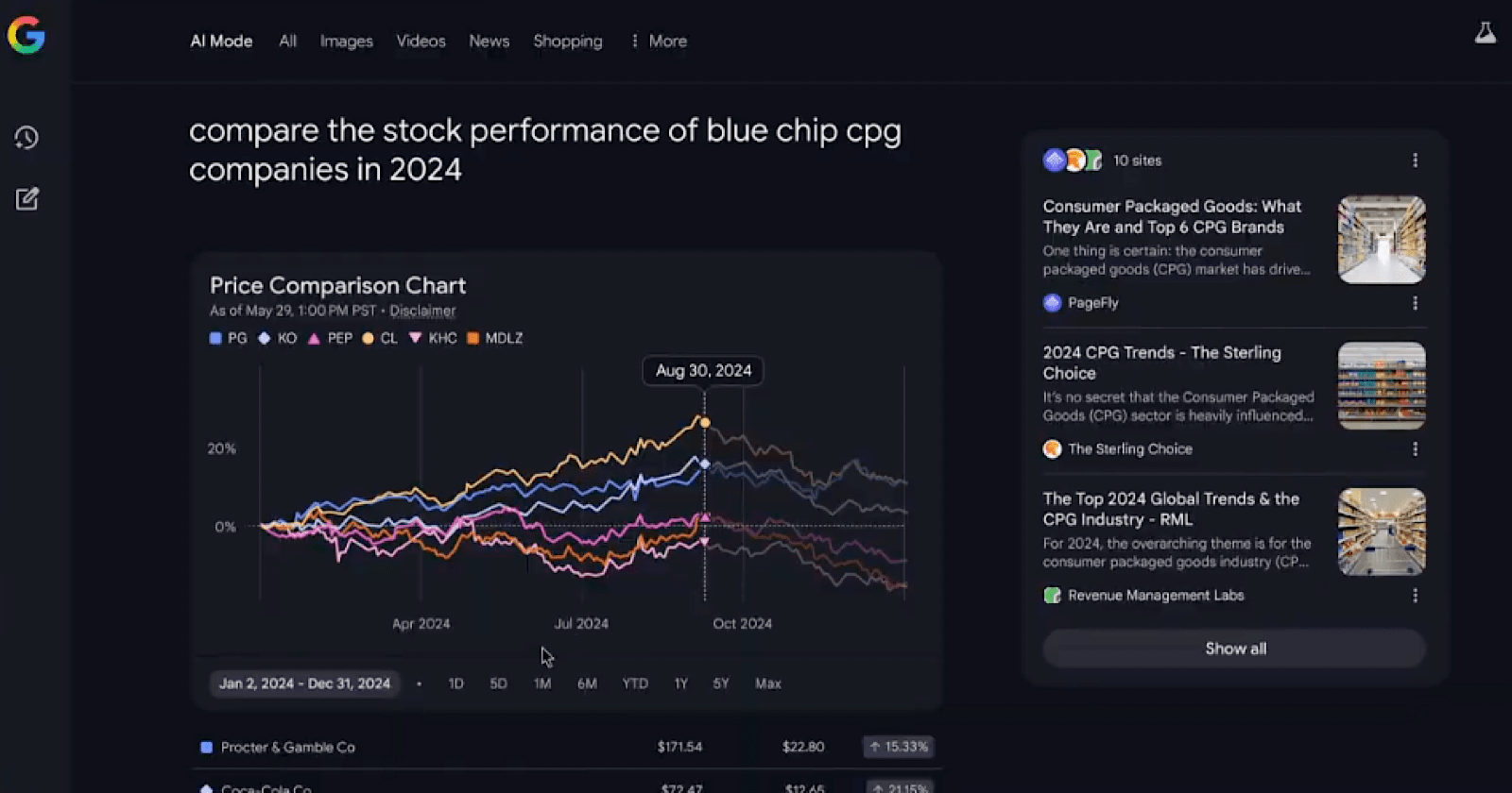 Soufi Esmaeilzadeh, Director of Product Management for Search at Google, explained that you can ask questions like “compare the stock performance of blue chip CPG companies in 2024” and get automated research with visual charts.