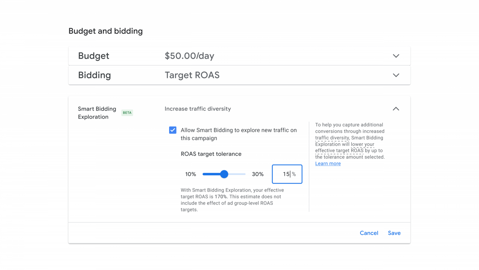 Advertisers can opt into Smart Bidding Exploration by giving Google permission to bid below their typical ROAS threshold, generally in the 10-30% range.
