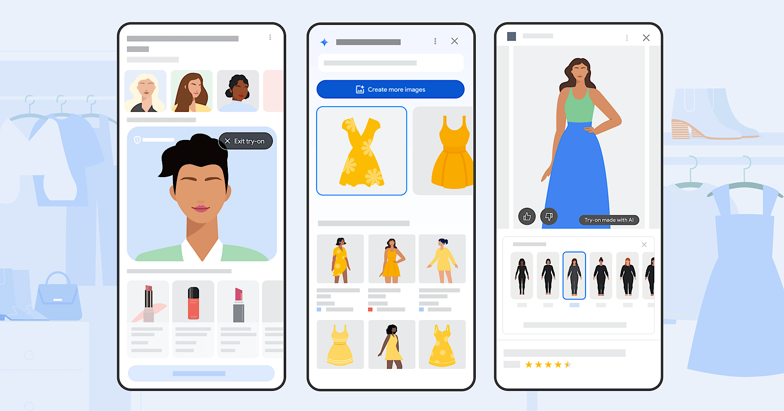 Screenshot from: blog.google/products/shopping/ai-vision-match-ar-beauty-virtual-try-on/, March 2025.Google updated its machine learning models to generate complete looks, when previously they were limited to generating tops only. Shoppers can access this feature by looking for items with a “try on” badge in Google Search or the Shopping tab on mobile and desktop platforms.