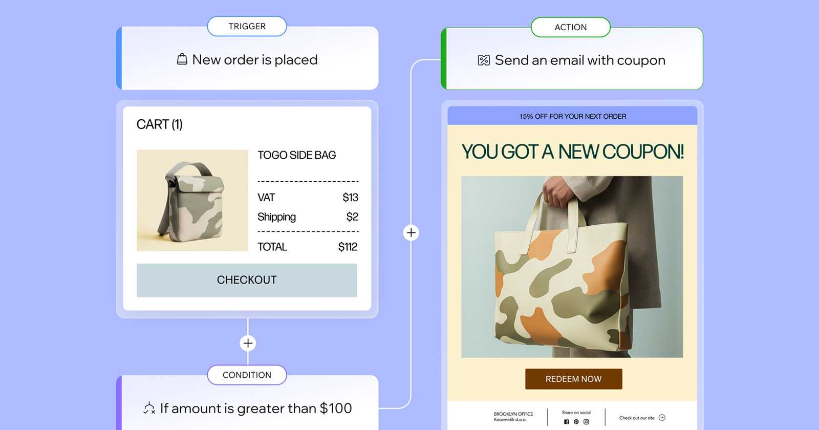 For example, a customer purchase can be the trigger to check a condition, such as whether the total is over $50. If the condition is met, a formula calculates a 10% discount, and the automation sends the customer an email with a discount code for a future purchase.